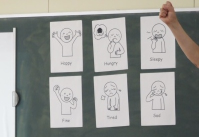 3年の英語活動は、happy、hungry、sleepy、fine、tired、sad等、気持ちを表すことばを学習しました。