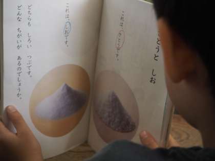 1年の国語は、「さとう と しお」の音読をしました。