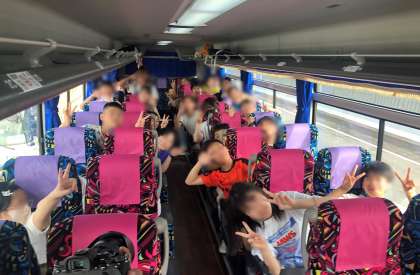 一つめの目的地、陶芸の里、信楽に向かいますバスの中では早速のにぎわいです。