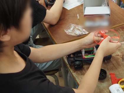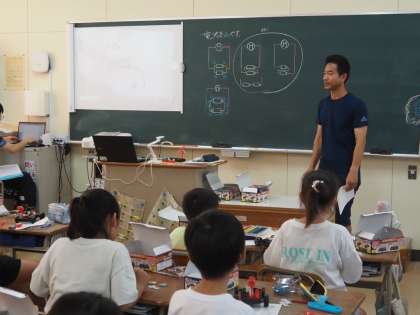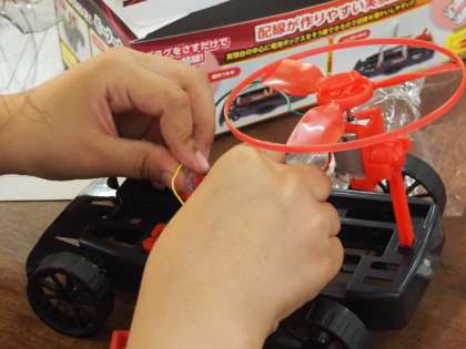電気が、明かりをつけるだけでなく、モーターを回すなどいろいろなはたらきがあることを学びます。今日は、モーターを使った模型を通して学習しました。
