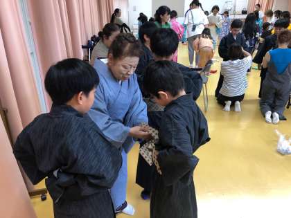 装道きもの学院の磯中ミツ子先生に、お越しいただき、子どもたちに着物の着付けを教えていただきました。