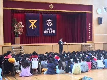 講堂では、1学年進級した子ども達が、新しい先生やクラスにドキドキしながら、大きな声で大阪市歌を歌って式が始まりました。新転任の教職員の紹介とあいさつ、離任した教職員からの手紙の紹介、校長先生の話、生活指導の先生からの話、と続いた後、いよいよ担任・担当の教職員の紹介です。先生の名前が告げられるたび、歓声や拍手が起こったり、新しい先生を興味深そうに見つめたりと、さまざまな反応がありました。最後に元気よく校歌を歌って式は終了。その後は講堂と運動場に別れて、ドキドキのクライマックス、クラス発表です。仲のよい友達とクラスが離れたり、今まであまり話したことのない友達と席が隣になったりと、子ども達はこの時期ならではの経験に一喜一憂していました。