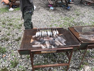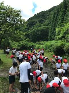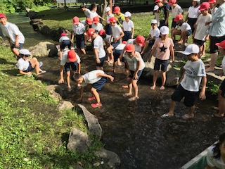 天然の川の水の冷たさに悲鳴をあげながら、必死でアマゴを追いかけています。