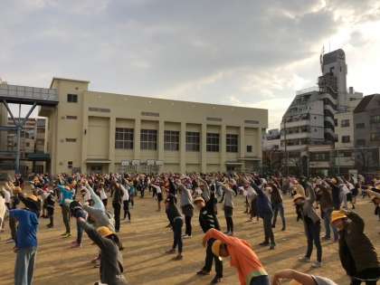 波除小学校では、毎週月曜日の児童朝会の際、子どもも先生も一緒にラジオ体操を行っています。今週は寒波がやってきてとても寒くなるという予報が出ていますが、今日もみんなでラジオ体操をして、一週間のスタートを切りました。