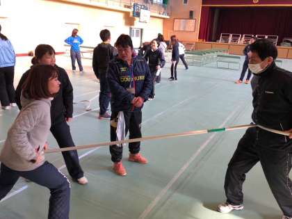 午前中の不審者侵入を想定した避難訓練と連動した形で、放課後に教職員を対象とした不審者対応の研修を行いました。港警察の警察官の方に再度お越しいただき、学校の各所にある「さすまた」の有効な使い方を教えていただきました。