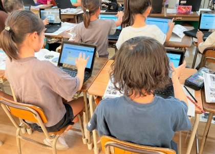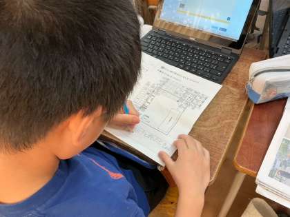 どこに何があるのか、何のための施設・設備なのかについて、学校内を調べ、1人1台端末で写真を撮り、グループで共有しました。