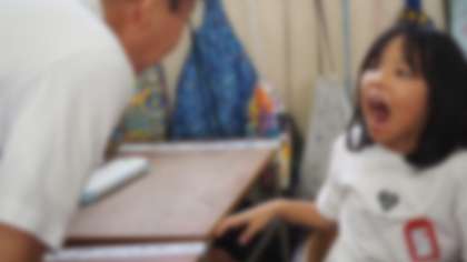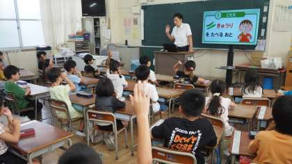 スライドを見ながら噛むことによるプラスの働きを学びました。そして、しっかりと噛むことで色が変色するという噛む実験用のキシリトールガムを子どもたち一人一人が噛み、どれくらい噛めているかを調べました。