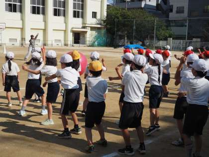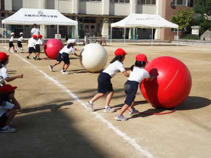 徒競走と大玉ころがしの2種目を本番さながらに練習しました。特に、大玉ころがしは、競技前にかわいいダンスをしますのでご覧ください。赤白そろぞれ2チームあり、引き分けの場合もあります。