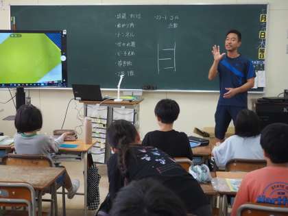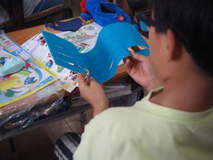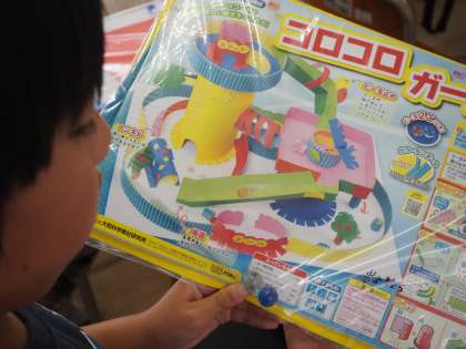 ビー玉が転がってゆくアイデアいっぱいのコースを作って楽しむ学習です。今日は、材料が配られて、坂やトンネルや、分かれ道や壁等の作り方を教わりました。