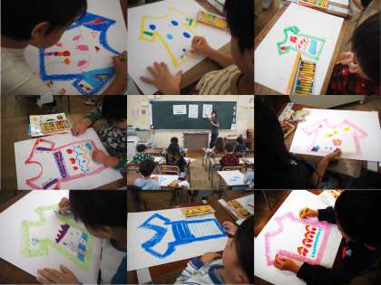 パスを使って、白いTシャツに、思い思いの絵や模様でデザインしました。