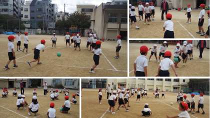 四角のコートの中にいる相手を外側の4面からボールを転がして当てます。とても盛り上がっていました。休み時間にも友だちとできそうです。