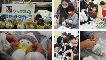 雨が降る天候でしたが、「くつした雪だるま作り」のワークショップの他に、アメリカンドッグやポップコーン、いかやき等の屋台、くじ引きもあり、200〜250人ほどの来場者があり、会館は大にぎわいでした。お祭りでは、子どもたちの笑顔をたくさん見ることができました。