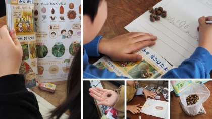 どんぐりや赤や黄色に色づいた落ち葉等を見つけました。教室に帰ってから、学習カードに見つけたことを書きました。