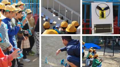 今日は、運動場に出て鏡を使って太陽の光を集め、太陽光発電により、音を鳴らしたりモーターで扇風機を回転させたりしました。
