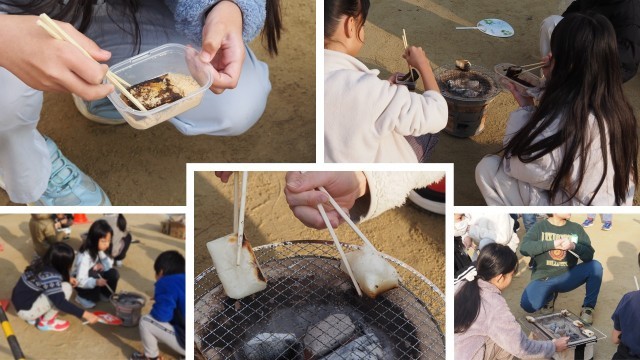 3年生では、七輪を使った餅焼きを体験しました。焼き加減が難しく、焦がしてしまうこともありましたが、粘り強く焼き具合を見たり、安全に気を付けたりしながら楽しく取り組んでいました。