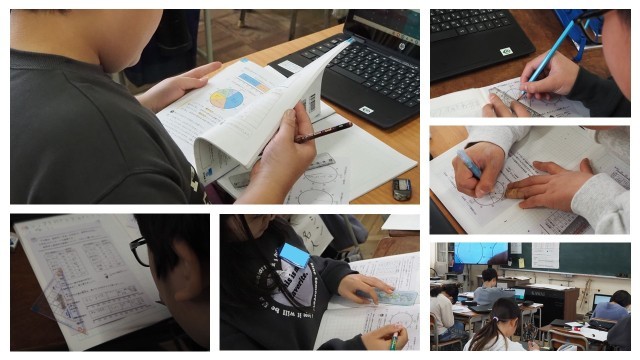 今日は、割合をグラフに表して調べようの学習です。教科書83ページの「好きな給食のメニュー」の表を84ページの円グラフに表す学習です。円グラフでも帯グラフと同じように、100に区切られたメモリを読んで、円の中心から直線で区切って円グラフにしました。