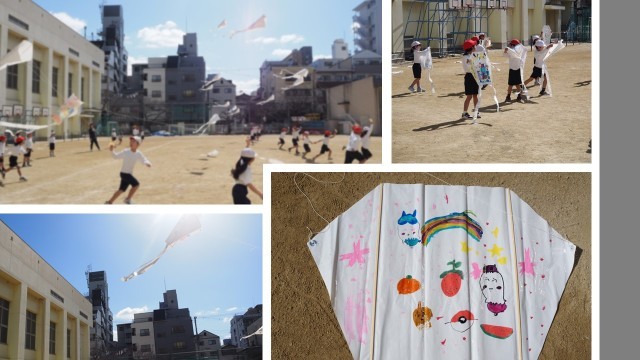 1年生は、この日生活科のむかしあそびの一環として、運動場で自分たちの作った凧をあげました。凧には、自分たちの思い思いの絵を描き、それを天高く飛ばしました。上手に凧をあげていました。凧あげを楽しむ子たちの顔は楽しさいっぱいの笑顔でした。