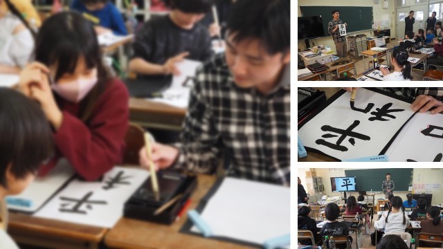 本校では、4年の教室で書道体験、5年の教室で英語学習に参加されました。