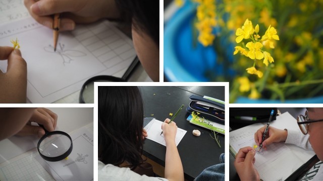 今日は、アブラナの花を観察し、絵にかきました。春は黄色い花が一面に咲き誇っていて、その花を教師が摘み取ってきて準備し、教材にしました。花の絵を描くことで、花のつくりや実がなっていくしくみへの関心を高めるようにしました。