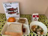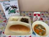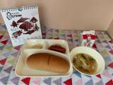 9月23日(水) 今日の給食は、フランクフルトのケチャップソース、スープ、焼き...