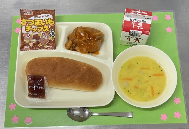 《今日の献立》煮こみハンバーグ、コーンスープ、おさつチップスコッペパン、いちごジャム、牛乳〜大阪市の給食のいろいろなパン〜 大阪市の給食では、子どもたちが楽しく食べられるよう、さまざまな種類のパンを提...