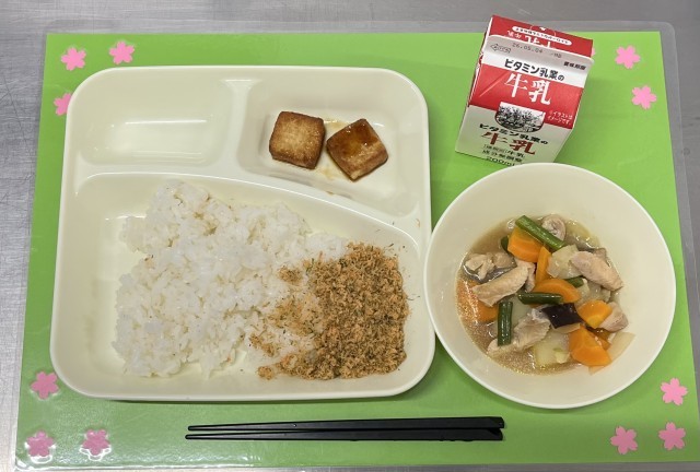 ≪今日の献立≫鶏肉のたつたあげ、五目汁、キャベツの梅風味、ごはん、牛乳給食は、3つのグループの食べ物がバランスよくそろっています。黄色は主にエネルギーのもとになります。赤色は主に体をつくるもとになりま...