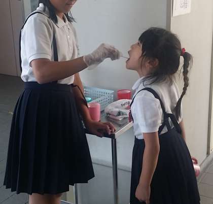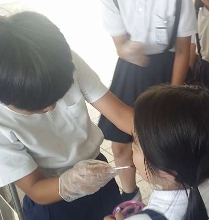 17日月曜日〜21日金曜日は、「歯みがき強調週間」です。給食の後、保健環境委員会を中心に歯垢染色(みがき残しチェック)を行っています。月曜日は、1年生でした。みんな丁寧に歯みがきをしていたようで、赤く染まる児童は、少なかったです。