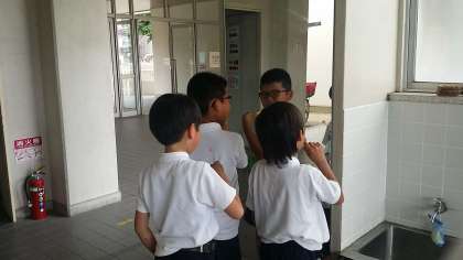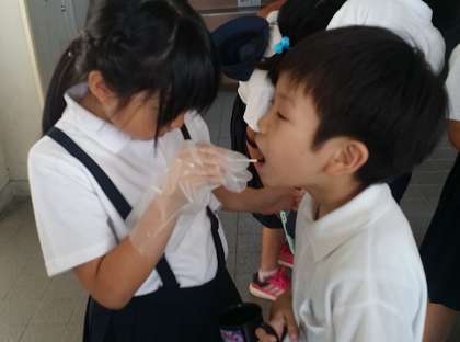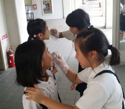 「歯磨き強調週間」3日目です。本日の歯垢染色(みがき残しチェック)は、3年生です。赤く染まったところも鏡をみながら丁寧に磨いています。