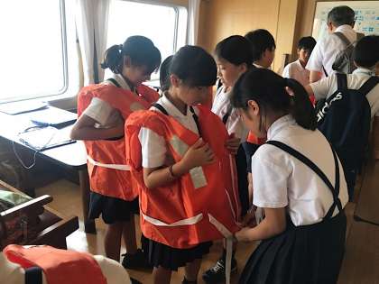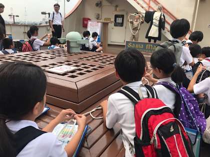 船内でロープワークや救命胴衣の着用方法を学んだり、サンタマリア号の船長の話を聞きました。