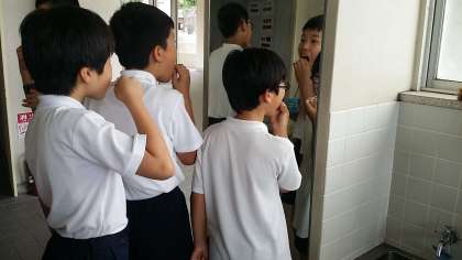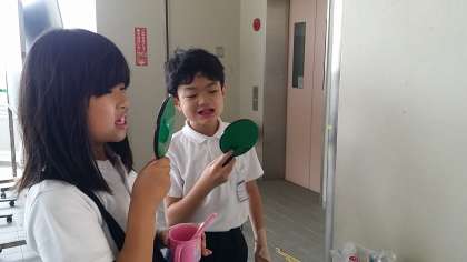 「歯磨き強調週間」最終日です。本日の歯垢染色(みがき残しチェック)は、4年生・6年生です。昨日に引き続き、高学年は、自分で染め出ししています。4年生も6年生をお手本にしながら染めています。歯みがき強調週間は、今日で終わりますが、引き続き歯みがきをしてほしいと思います。
