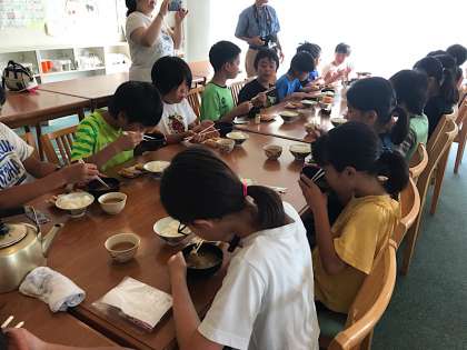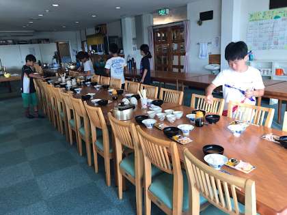 朝のつどいの後は朝食です。林間学習では、食事の準備も係の仕事です。みんなより早めに食堂へ来て、準備をしてくれました。