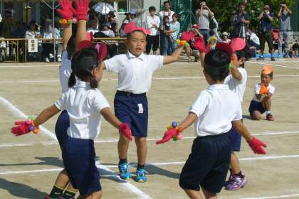 団体演技の「がっこうへいこう!」では、頭に耳をつけ、手にはカラー軍手と鈴をつけて踊りました。1年生にとっては、小学校ではじめての運動会。