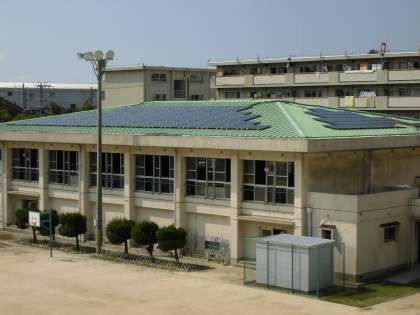 築港小学校講堂上に太陽光パネルが設置されました。発電された電力は講堂玄関横のモニターで見ることができるようになります。災害時にはモニター下のコンセントから直接電源として使うことができるようになりました。(※発電開始は10月頃の予定です。)