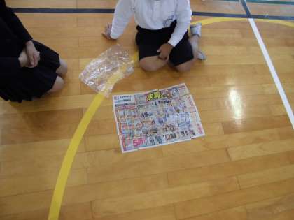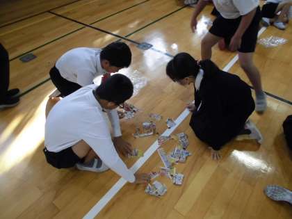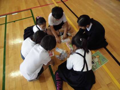 今日の児童集会は「広告パズル」でした。たてわり班の友だちと協力して、切られた一枚の広告を時間内にそろえていました。班の友だちと楽しそうに活動していました。