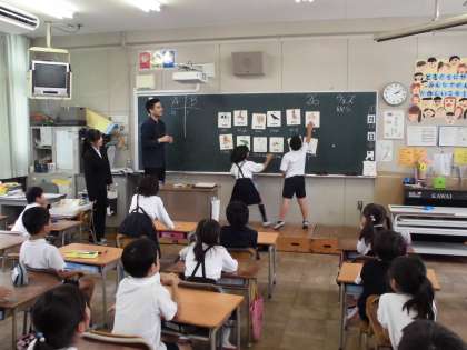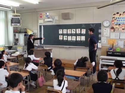 5時間目、2年生はウェズ先生と英語学習を行いました。いろいろな動物の名前を英語で教えていただいたり、その動物の鳴き声を英語で言ってみたりしました。子どもたちは、日本語の鳴き声と英語での鳴き声の違いに驚いていました。最後には、動物鳴き声あてゲームをして英語学習を楽しんでいました。