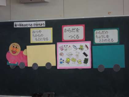 2年生は4時間目に栄養授業がありました。「熱や力のもとになる食べ物」」「体をつくる食べ物」「体の調子を整える食べ物」にはどんな食べ物があるのか、身近な食品を発表し合い、仲間分けをすることができました。どの食品にも体を健康に保つには大切な働きがあることを知り、楽しく学習に取り組むことができました。