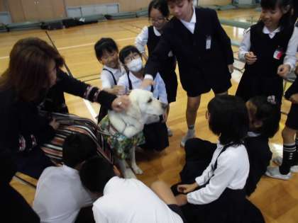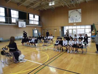 3年生は講師の先生を招いて、盲導犬の学習を行いました。視覚障がいの方が盲導犬と共に歩く様子を見せていただいたり、点字についてのお話や白杖を持って点字ブロックの上を歩いたりさせていただきました。最後は今日の学習を振り返って、わかったことや感心を持ったことについて子どもたちは発表することができました。とても貴重な体験をさせていただきました。