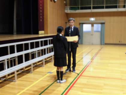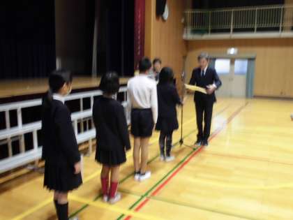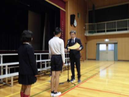 今日の朝会で夏休みの課題学習「税に関する習字」で表彰された4名の児童に表彰状を渡しました。