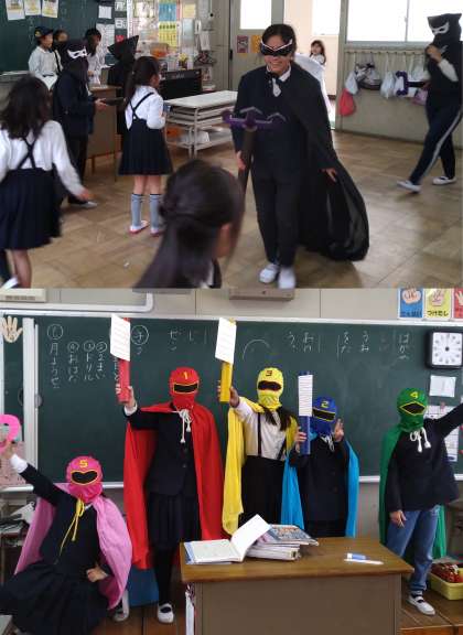 今日も児童に大人気のミガクンジャ—とむし歯菌の登場です。今日は、最終日ということで全員集合です。