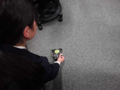 5時間目、6年生は中学校の出前授業を受けました。静止しているロボットの車を動かすために、パソコンを使って前進や後進の動きの指示を与え、プログラミングをすることができました。子どもたちは自分の指示した通りに車を動かし、とても楽しそうに活動することができました。
