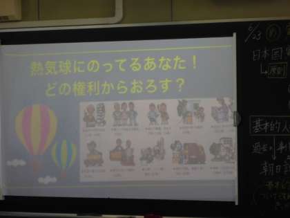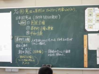 6年生は日本国憲法の三原則の一つ、基本的人権について学習しました。子どもたちは、人が生きていくためにはとても大切な権利であることを知り、あたり前にあるものだと思っていた権利が、「もしも、・・・の権利がなくなったら、どうする?」の担任の問いかけに、どんな生活になるのだろうかと想像していました。どの権利もとても大切な権利だと気付くことができました。