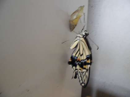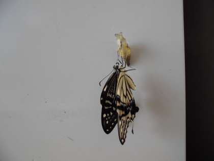 今朝、管理作業員室の前にある掃除ロッカーにくっついていたさなぎが羽化してチョウになりました。とてもきれいな羽のキアゲハです。登校した子どもたちは歓声をあげて観ていました。