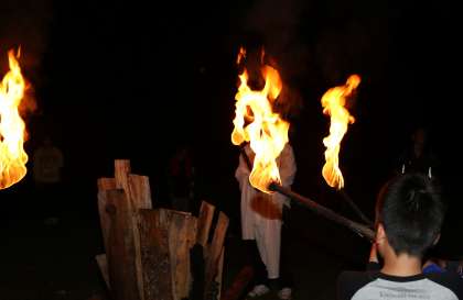 夜にはキャンプファイヤーをしました。火の神の登場!キャンプファイヤー係がんばりました。