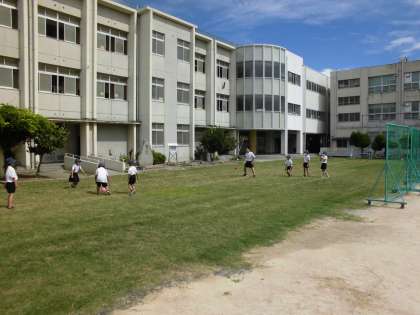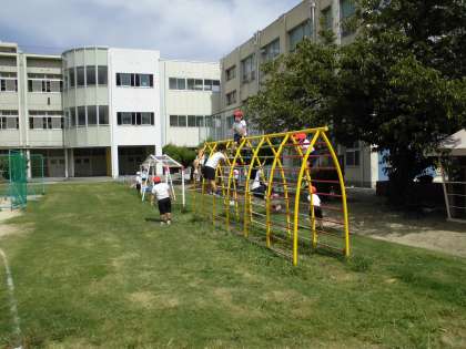 休み時間はいろいろな学年が一緒になって遊んでいます。高学年のお兄さんは低学年の児童が受け取りやすいようにボールを投げていました。ろくぼくやうんていは子どもたちに大人気です。芝生の上で楽しそうに遊んでいました。