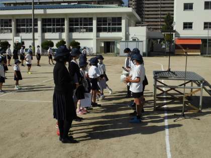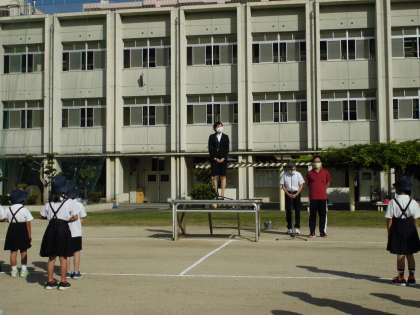 今日の児童朝会では教育実習生の紹介がありました。今日から2週間、子どもたちと一緒に勉強をしたり、運動をしたりします。よろしくお願いします。