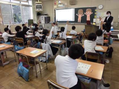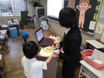 2年生は保健の学習で体を清潔に保つことの大切さを知り、正しい手の洗い方を学習することができました。教育実習に来られた先生から実際に手を洗う方法を教えてもらい、せっけんで手を洗いました。そして、最後はマイクロスコープで手の汚れが落ちていることを確認することができました。どの児童も「手洗い名人証」を受け取ることができました。