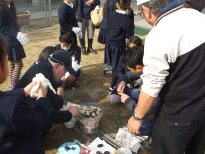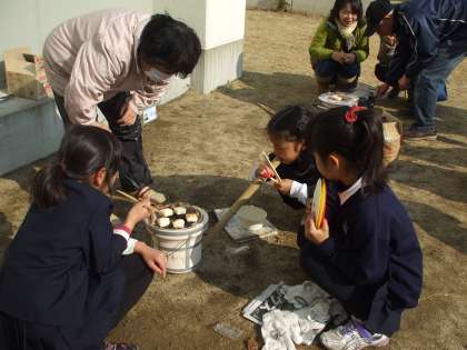 炭に火をつけるのに時間がかかりました。地域の方が火吹竹を持ってきてくださいました。保護者の方も火をつけるのを手伝ってくださいました。七輪でお餅と干し芋を焼いて食べました。「おいしい!」と言って子どもたちはお餅を食べていました。砂糖醤油で食べました。炭で焼いたお餅や干し芋は、いつも食べるお餅と違っておいしかったようです。