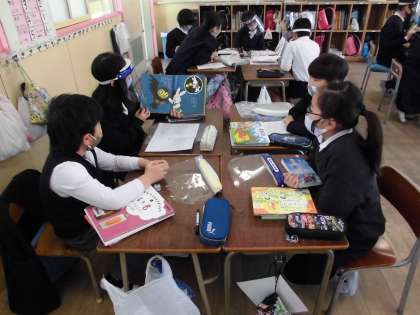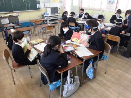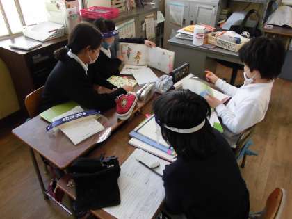 4年生は2時間目、国語科の学習で本の紹介「ブックトーク」をしていました。それぞれの児童が友だちにぜひ読んでほしいおすすめの本を紹介していました。発表する児童は読んだ感想やあらすじ、そして紹介する本のおもしろいところなどを伝えていました。聴いている児童は物語の世界に引き込まれるように、真剣な表情で聴いていました。とても楽しそうにグループ活動をしていました。