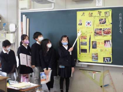 3年生は社会科の学習で世界の国について調べ、壁新聞にまとめることができました。調べた国の特徴や文化についてグループで協力してまとめ、発表することができました。聴いている友だちも調べた国や住んでいる日本と比較して、似ているところや違うところの特徴に気づき、感想を発表することができました。