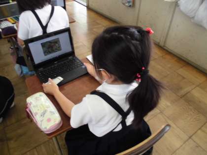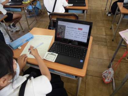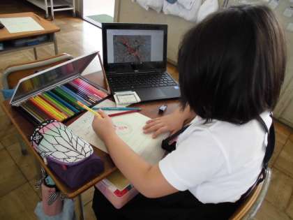 2時間目、2年生は生活科「ザリガニを育てよう」の学習に取り組んでいました。ザリガニの育て方をそれぞれの児童がパソコンを使って調べていました。子どもたちが知りたいことをインターネットで見つけ、育てるポイントを絵や文字でまとめることができました。